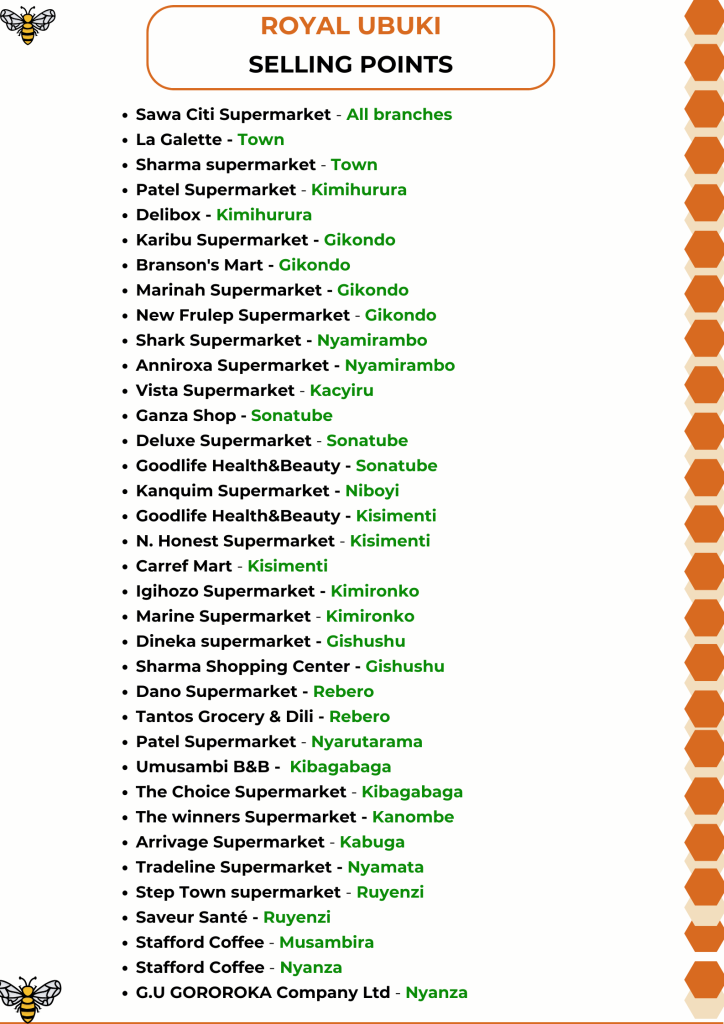 La renommée de notre miel « ROYAL UBUKI »a franchi les frontières, grâce à sa qualité inégalée. Il a été récompensé par quatre médailles d’argent : une en 2022 au concours honorifique du CARI en Belgique, une autre au London International Honey Award la même année, puis une troisième en 2023 toujours à Londres, et une quatrième aux Arab Honey Awards en 2024. En 2025, il a reçu la medaille d’or au prestigieux London International Honey Awards.